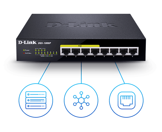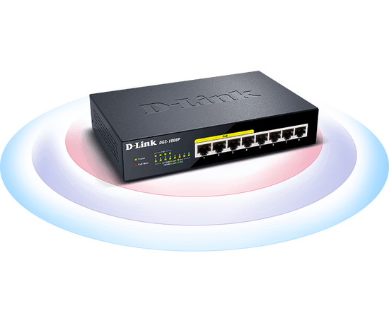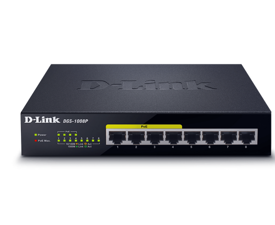 The D-Link DGS-1008P 8-Port Gigabit PoE Unmanaged Desktop Switch enables home and office users to easily connect and supply power to Power over Ethernet (PoE) devices such as wireless access points (APs), IP cameras, and IP phones. It also provides the opportunity to add additional Ethernet devices like computers, printers, and Network Attached Storage (NAS) onto a network. This compact PoE switch operates quietly, making it ideal for use in virtually any room or office.