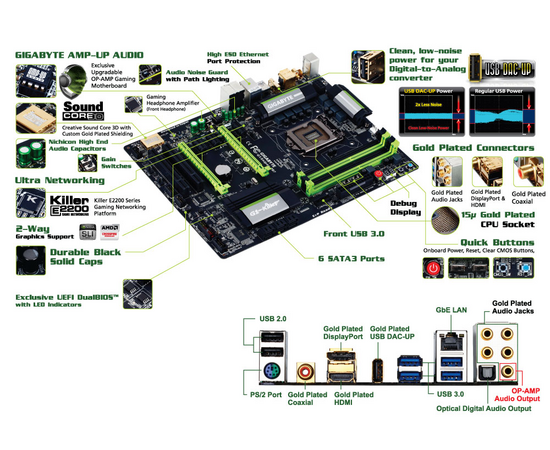 GIGABYTE G1-Killer motherboards pack top quality gold plated audio and HDMI connectors for improved connectivity and long lasting durability. Gold has superb signal conductivity and will not tarnish over extended periods of use. The Creative Sound Core3D™ processor is also shielded by a gold plated cover which eliminates electrostatic interference.