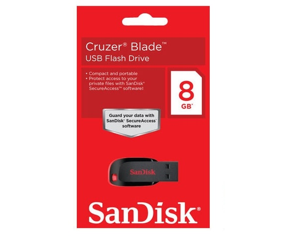 The 8GB Cruzer Blade USB Flash Drive may look small, but it has all the space you need to store and share tunes, pictures and home videos or your presentations and spreadsheets whenever you want. Despite storing 8GB in a compact and contoured design, the Cruzer Blade USB Flash Drive is barely half the size of most USB Flash Drives. It makes sure that your private files stay protected, with the password protection and encryption offered by SanDisk SecureAccess software. Getting more from your USB Flash Drive The capacity you need to store more 8GB Cruzer Blade USB Flash Drives give you plenty of headroom, just in case. Even with Full HD video and high resolution images hungry for storage space, you have ample space for storing and sharing the videos, photos and music you love and the work you need to do. Small but perfectly formed The 8GB Cruzer Blade USB Flash Drive is one of the smallest in our range at just over 4cm long and at 2.50g, it is also incredibly light making it superbly easy to take around with you. Fit the USB Flash Drive comfortably in the palm of your hand, slide it into a pocket or hang it from your keychain. Stay protected with SanDisk SanDisk SecureAccess software makes it easy to protect personal or critical files such as business presentations or legal documents. Simply drag and drop files into the vault and they'll be protected by a personal password and automatic 128-bit AES encryption. This means that your content will stay private and secure when you take the drive out and about, or if you store it away for safekeeping. Compatibility The Cruzer Blade USB Flash Drive is optimised for laptops and devices with USB 2.0 ports. Reassurance with performance SanDisk develops and engineers its USB Flash Drives to maximise reliability, so you can count on your 8GB Cruzer Blade USB Flash Drive to store your important files. You can enjoy yourself or work away with total peace of mind. 8GB Cruzer Blade USB Flash Drives are backed by a five-year limited warranty. Trust in SanDisk All SanDisk products are constructed to the highest standards and rigorously tested at every stage of production, so you can be confident in the outstanding quality, performance and reliability of every SanDisk product.
