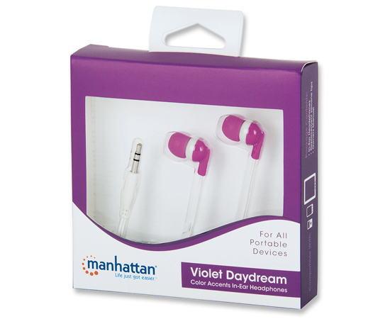 With a standard 3.5mm audio input for use with smartphones, tablets, MP3  players, notebook computers and other portable devices, these Violet  Daydream In-Ear Headphones are ideal for travel, recreation and everyday  musical enjoyment.